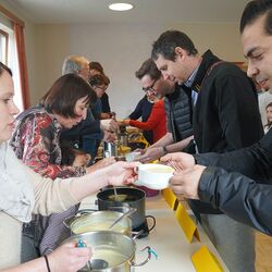 Nach der liebevoll gestalteten Wort-Gottes-Feier mit WGF-Leiterin Elisabeth Schöpf, traf man sich zum Suppen-Essen im Pfarrheim. Und wir hatten zweimal „volles Haus“, zuerst in der Kirche und dann im Pfarrheim! Über die vielen Gäste freuten sich der Pfarrgemeinderat und eine Firmgruppe mit ihren Begleiterinnen, die Suppe gekocht hatten und fleißig mitanpackten, sodass der Suppensonntag ein toller Erfolg wurde. Der Erlös kommt der KFB und der Pfarrcaritas zugute.
